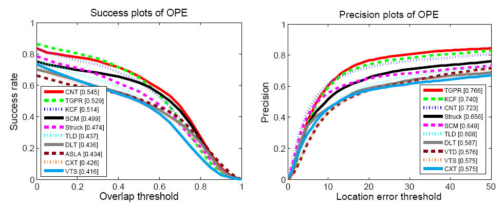 Figure 2 - The success plots and precision plots of OPE for the top 10 trackers. The performance score of success plot is the AUC value while the performance score for each tracker is shown in the legend. The performance score of precession plot is at error threshold of 20 pixels. |